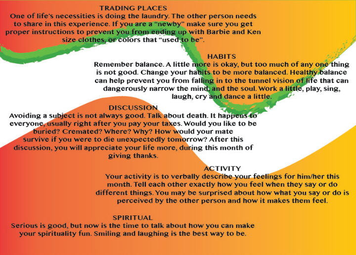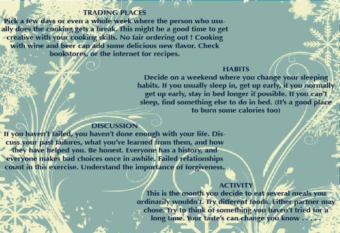 | The purpose of the relationship calendar is to expand your horizons, have fun and expose you to a wider variety of meaningful experiences. An agreement or contract may not be right for most people, but this calendar is. Use it as a marriage calendar. The Intimate Edition suggestions will give you ideas to keep your sex life interesting and more fun. The Religious calendar will help stimulate your spiritual life. Take advantage of these suggestions and make some of your own. Your life will be better; therefore, your relationship will be better. The calendar will inspire you to use your imagination and is a key element of the success of your calendar. |